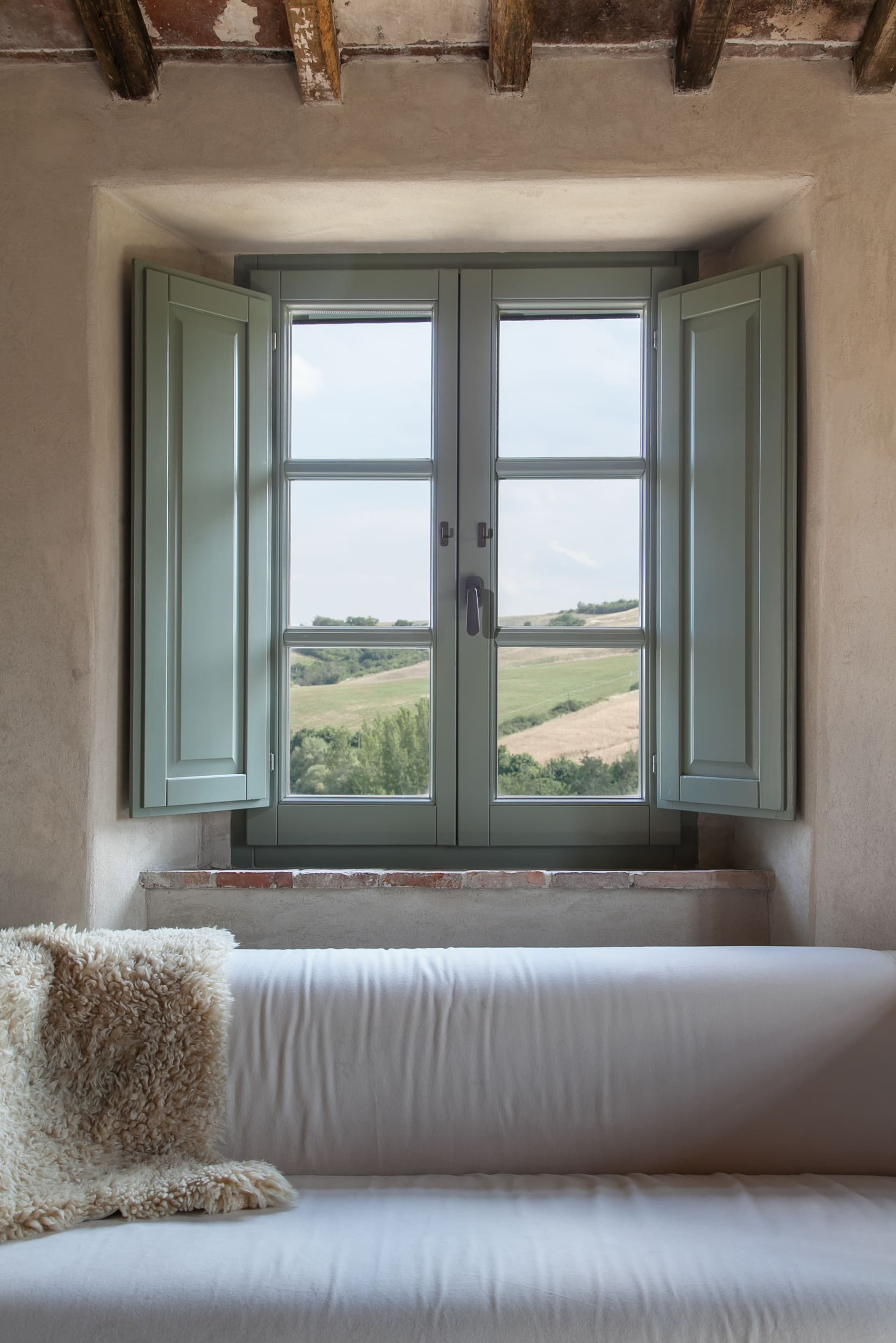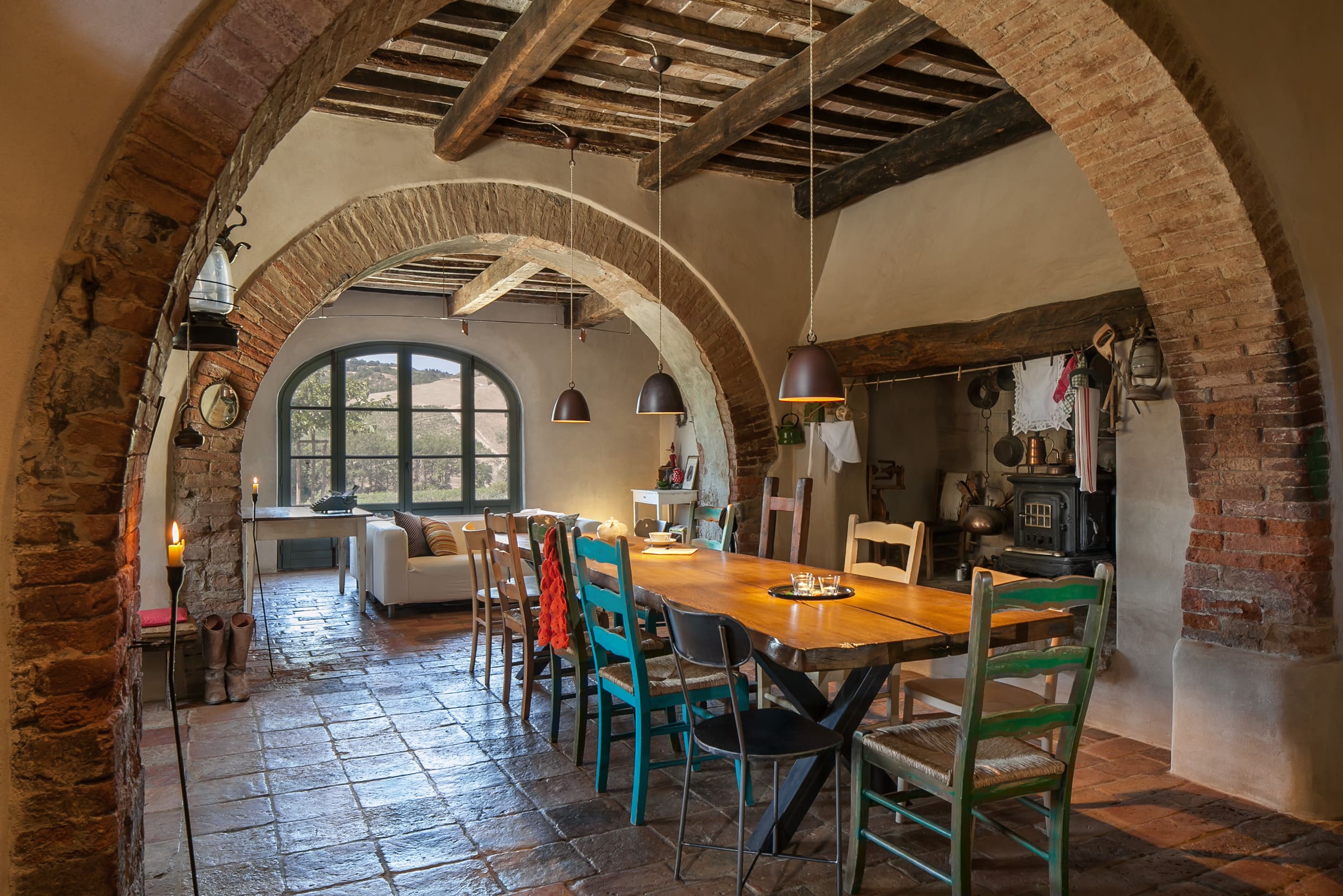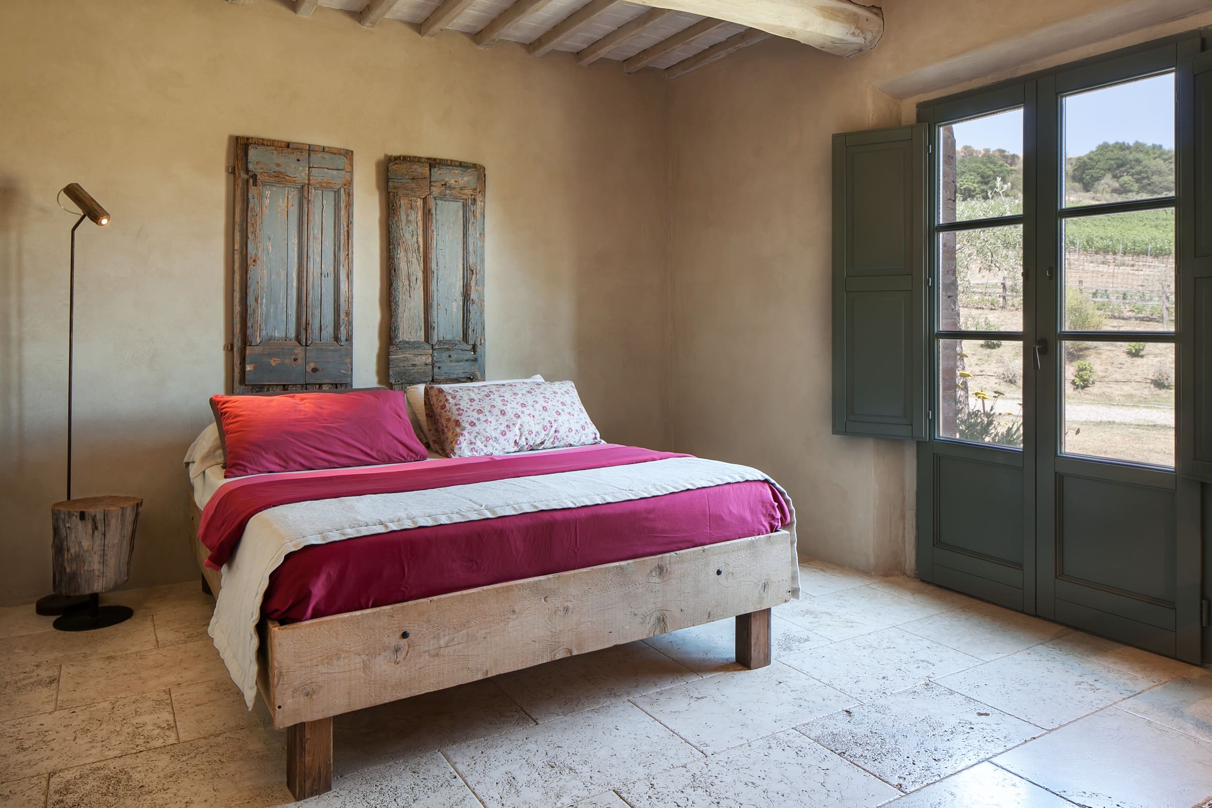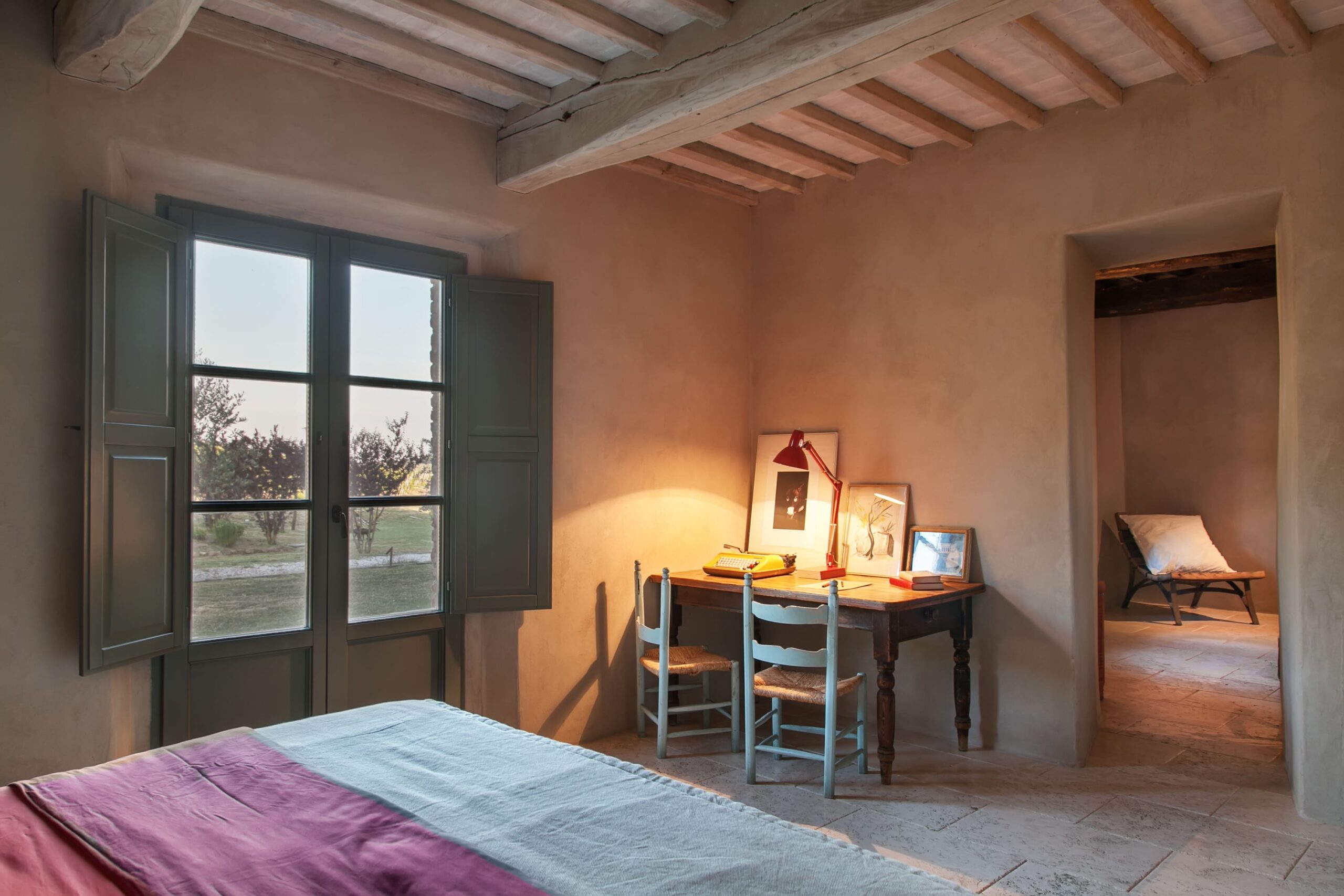 Accommodation is intentionally limited, with four suites and two rooms, all restored with respect for the old farmhouse and finished with a relaxed, “rustic-meets-modern” eye. Expect exposed beams, antique details and natural materials, paired with contemporary comfort so it never feels heavy or old-fashioned. Each space is different, but the feeling stays consistent: private, cosy, and designed for deep sleep after a day of Tuscan wandering.