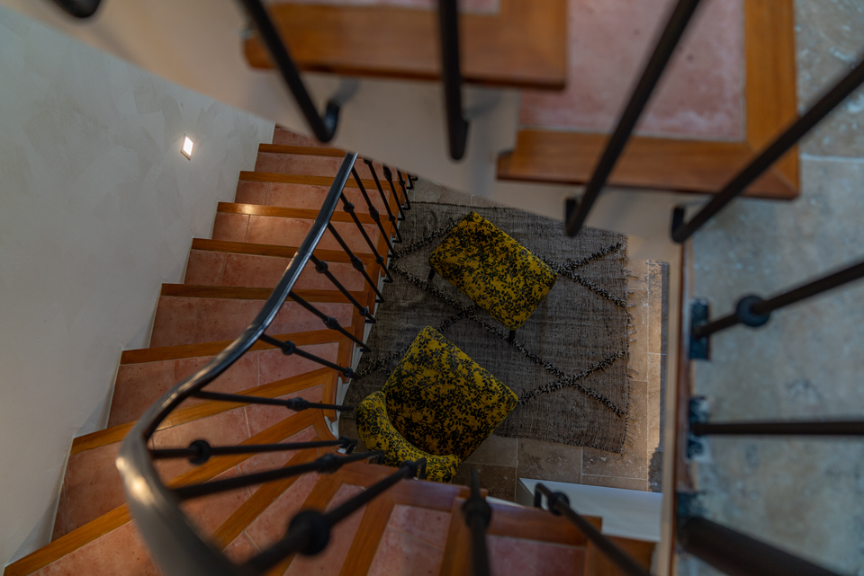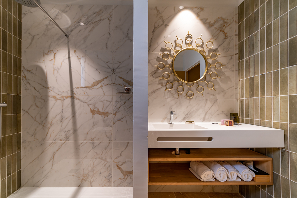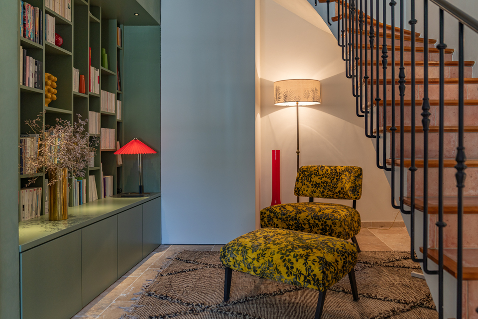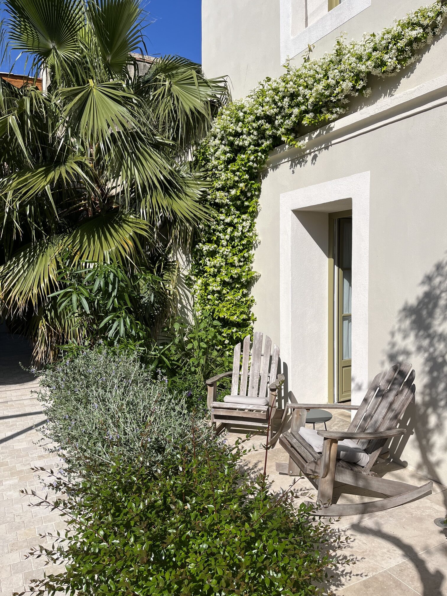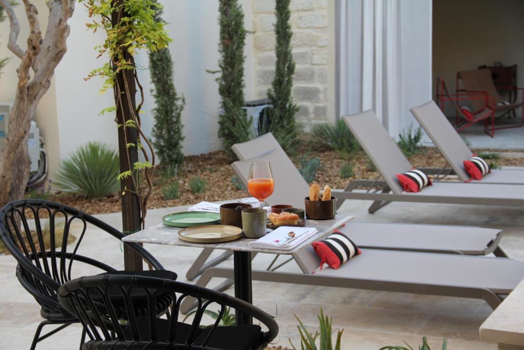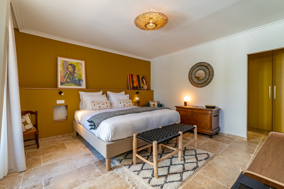 The maison offers two rooms and one suite, each housed on its own level to ensure privacy. Sous l’Olivier opens directly onto the courtyard at ground level, while the striking Royale Marcelle suite (41 m²) occupies the first floor, complete with cozy reading lounge and freestanding tub. Topping it off is Toit Mon Toit, a luminous rooftop hideaway crowned with skylights and views over the town’s terracotta roofs and distant marshes. Every space features limestone flooring, reclaimed beams, designer furnishings, plush linens, and fully air-conditioned comfort.