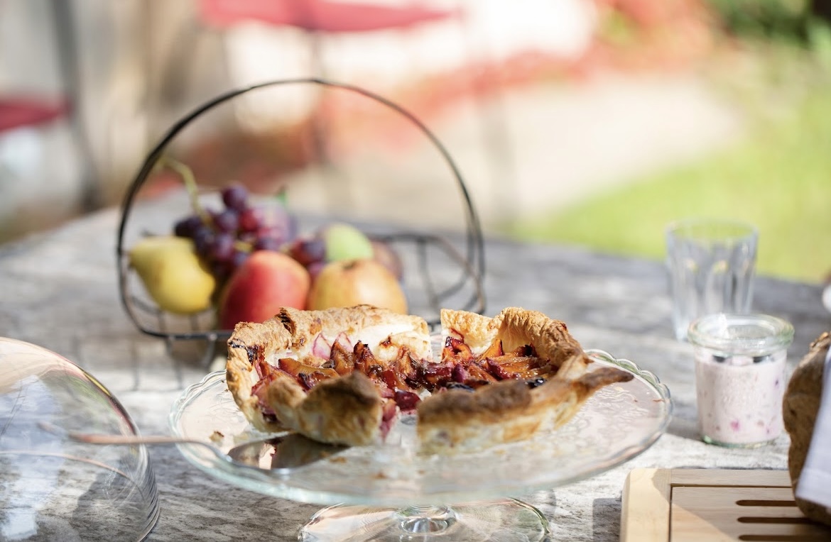 Guests gather for breakfast in a bright ground‑floor room that opens onto a large furnished garden. The buffet celebrates local produce and seasonal flavours, with homemade jams and cakes, yogurt, cheese and eggs from nearby farms, organic honey, fresh fruit, coffee, tea and herbal infusions—all available throughout the day.